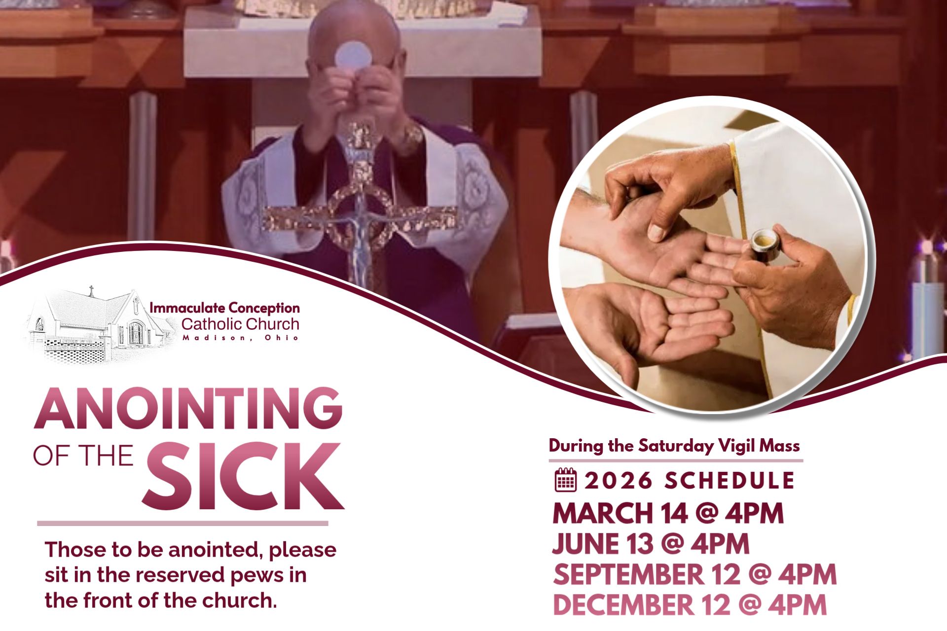 For more information or to begin the process, please contact the Immaculate Conception Parish Office at office@iccmadison.com or call (440) 428-5164.
