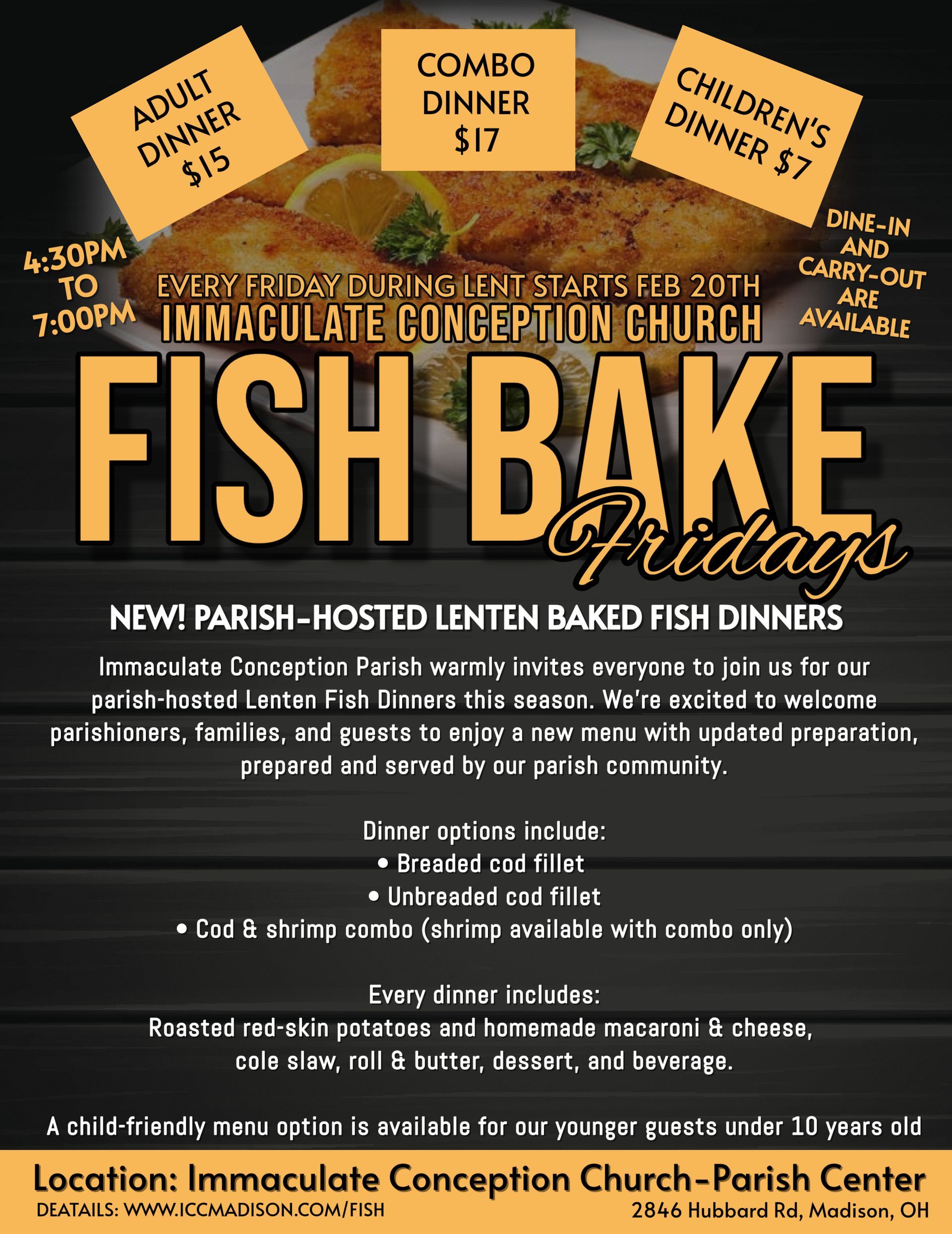 Immaculate Conception Parish warmly invites everyone to join us for our parish-hosted Lenten Fish Dinners this season. We’re excited to welcome parishioners, families, and guests to enjoy a new menu with updated preparation, prepared and served by our parish community.